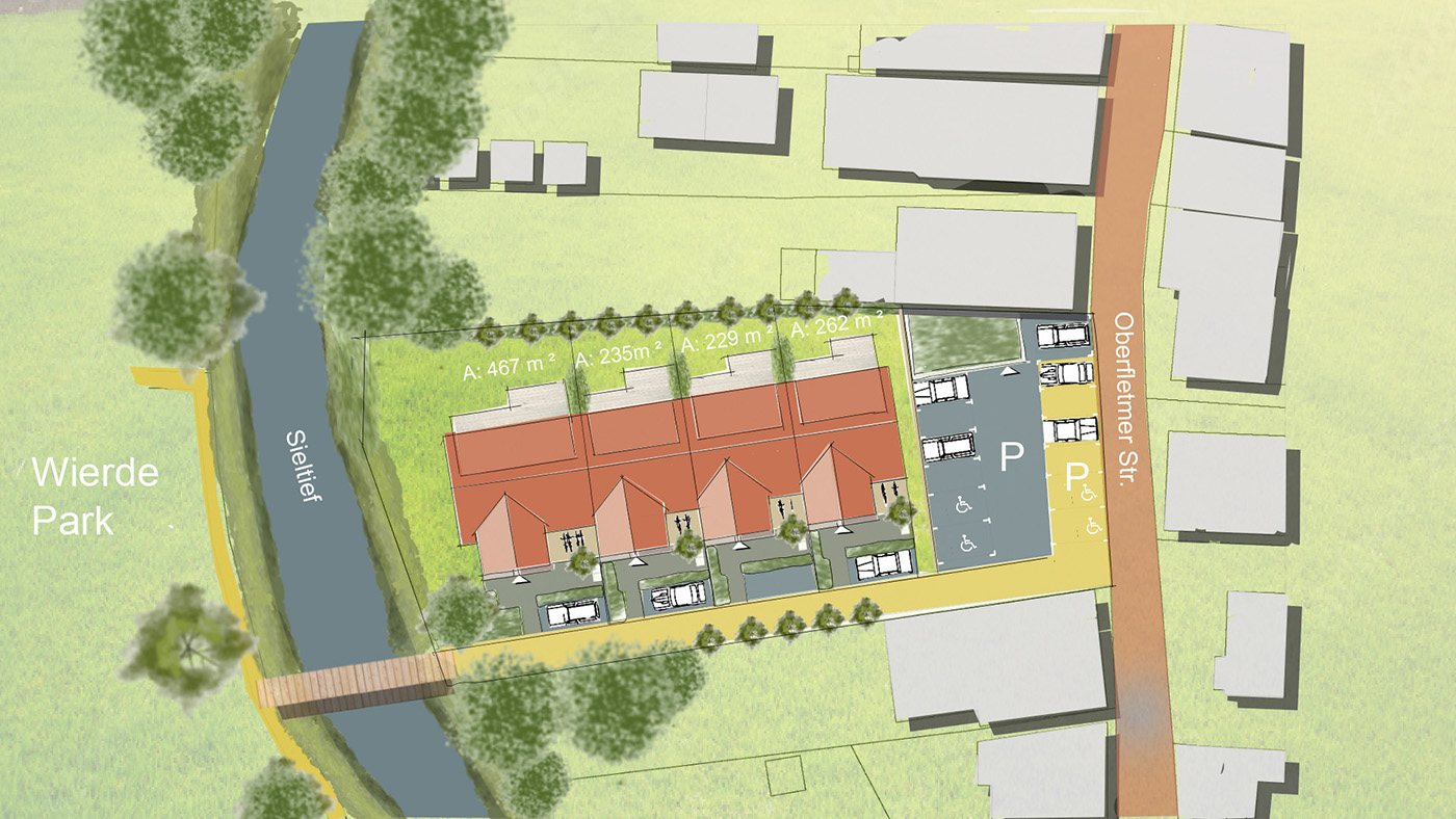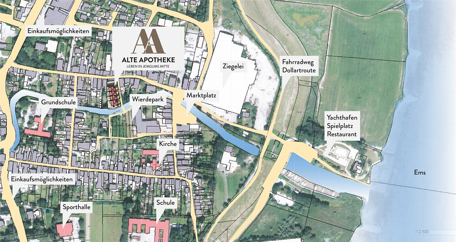 Durch den Ortskern von Jemgum fließt das Jemgumer Sieltief mit angrenzenden Grünflächen. Die große, öffentliche Parkanlage „ Auf der Wierde“ grenzt im Ortskern an das Sieltief an. Die öffentliche Parkanlage „Auf der Wierde“ wird ab 2024 von der Oberfletmer Straße aus über einen öffentlichen Gehweg und einer Brücke über das Jemgumer Sieltief erschlossen. Richtung Osten gelangt man ab hier auf einem Fußweg, entlang des Wasserlaufes in den Bereich des alten Hafengeländes, dem heutigen Marktplatz und der Markststraße mit historischer Bebauung, unter anderem dem historischen Amtshaus (befindet sich zurzeit im Umbau zum öffentlichen Bürgerhaus, Fertigstellung Ende 2023), dem Sielhus (historische Gaststätte) und dem Pflegeheim. Von hier aus ist der heutige Jachthafen fußläufig zu erreichen. Richtung Südwesten gelangt man zur historischen Jemgumer Mühle. Auch die Kirche, das Rathaus, sowie öffentliche Verkehrsmittel sind fußläufig zu erreichen.